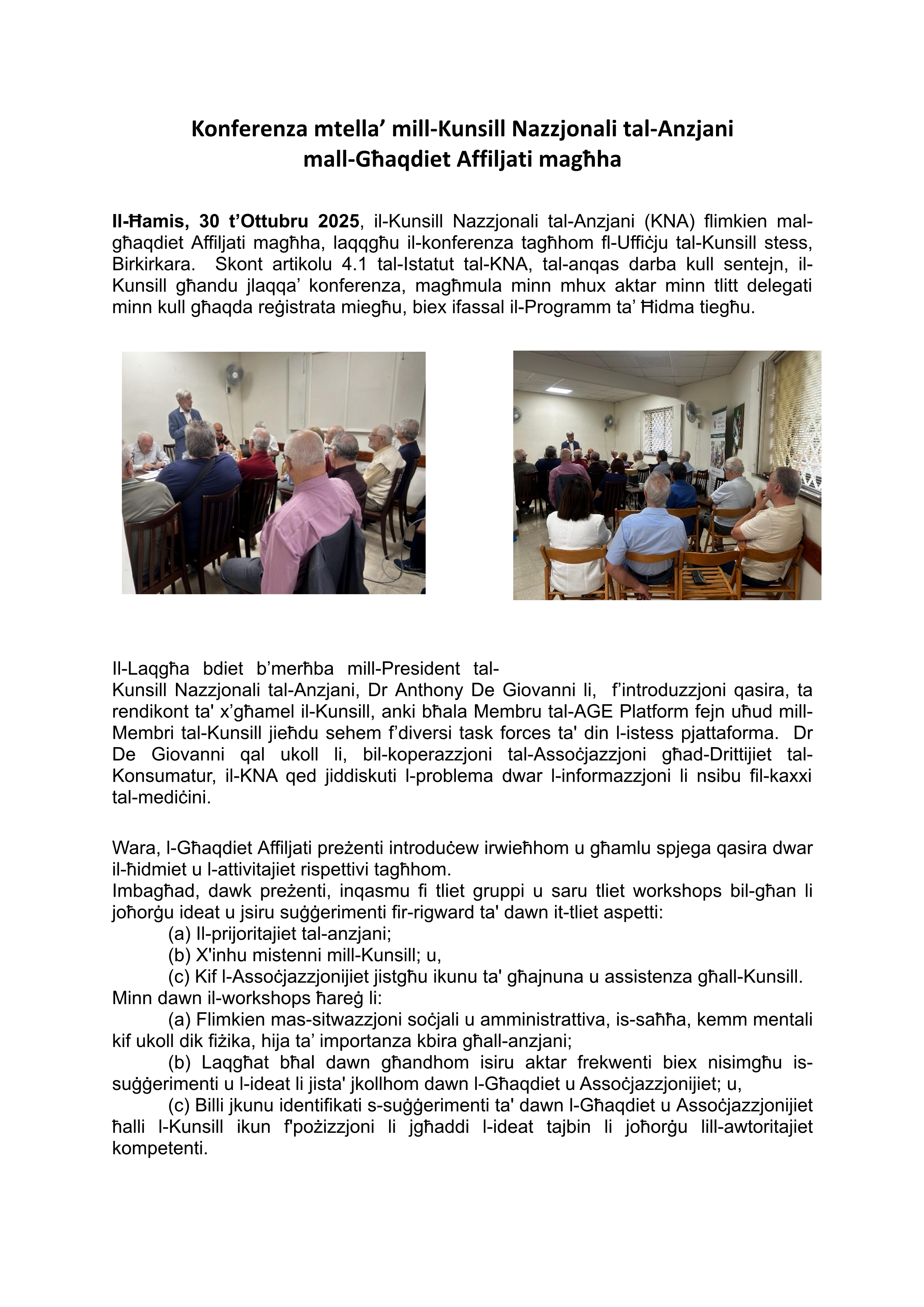 | AGE Platform Eourpe Active Ageing Services Association of Pensioners Telemalta/Maltacom/Go BOV- Pensioners Association Elderly Section Caritas (Malta) Friends of the Sick and Elerly in Gozo GWU Association of Pensioners MAS (Elderly Section) MUT (Retired Section) Pembroke Association of Pensioners PL Association of Veterans Social Assistance Secretariat (Elderly Section) WSC WWD Association of Pensioners | Association of the u3e CBM Pensioners Association Floriana Senior Citizens Ghaqda Nanniet Malta Malta Association of Retired Police Officers MUMN (Pensioners section) National Association of Pensioners Pensioners Section Social Association– SVPR PN Association of Pensioners U.H.M. Pensioners Section |
